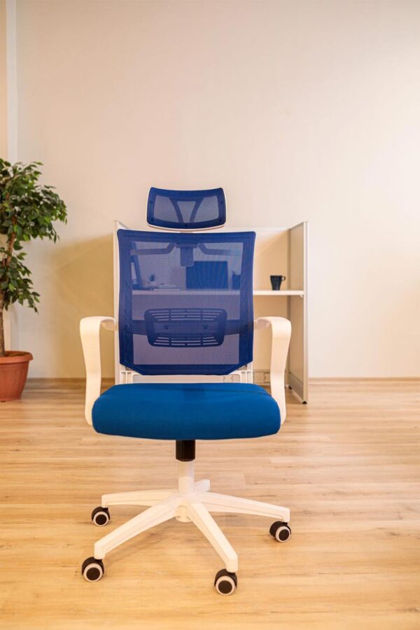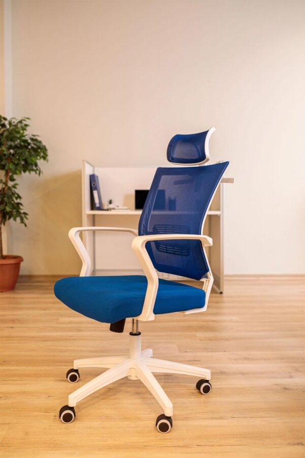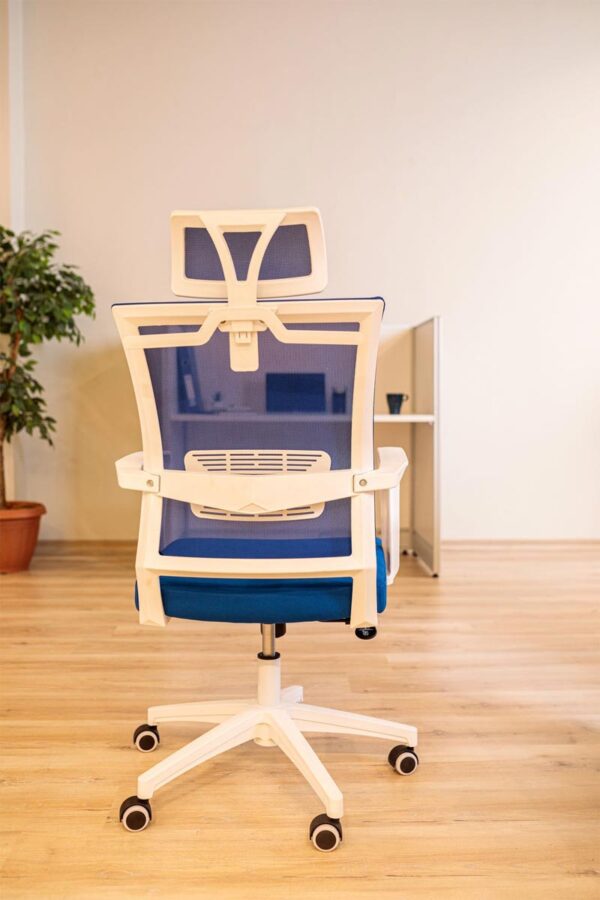 High Back Mesh Chair – Blue Mesh with White Frame and Base