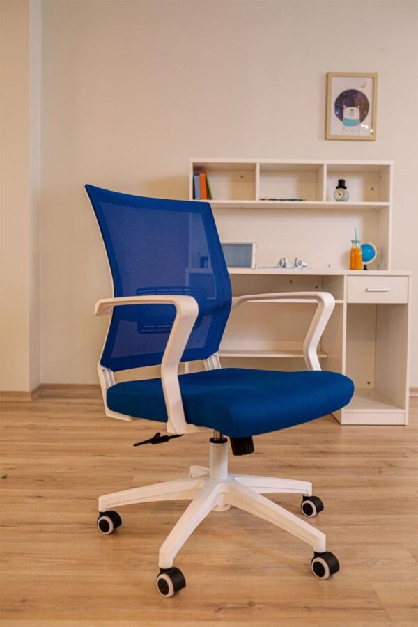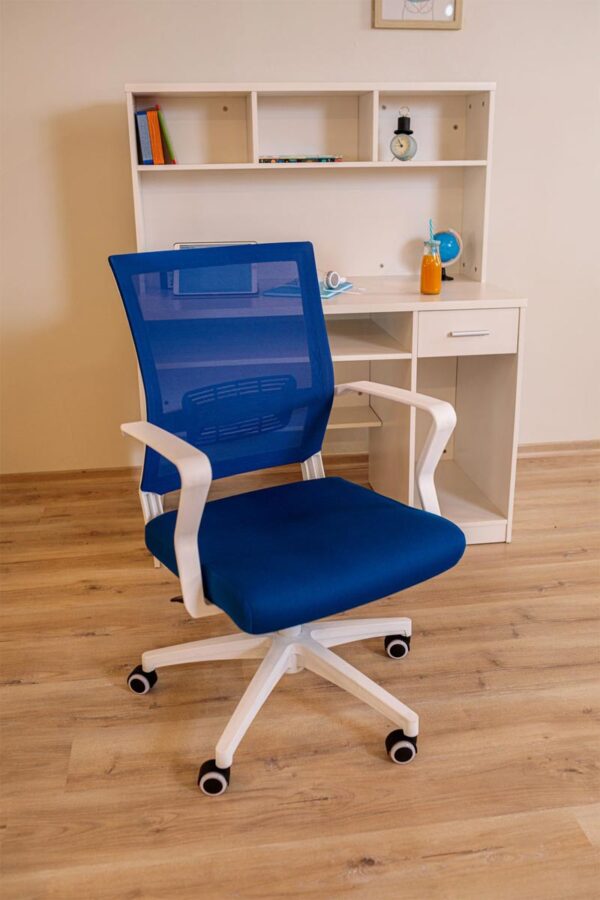 Low Back Mesh Chair – White PP and Blue Mesh and Cushion